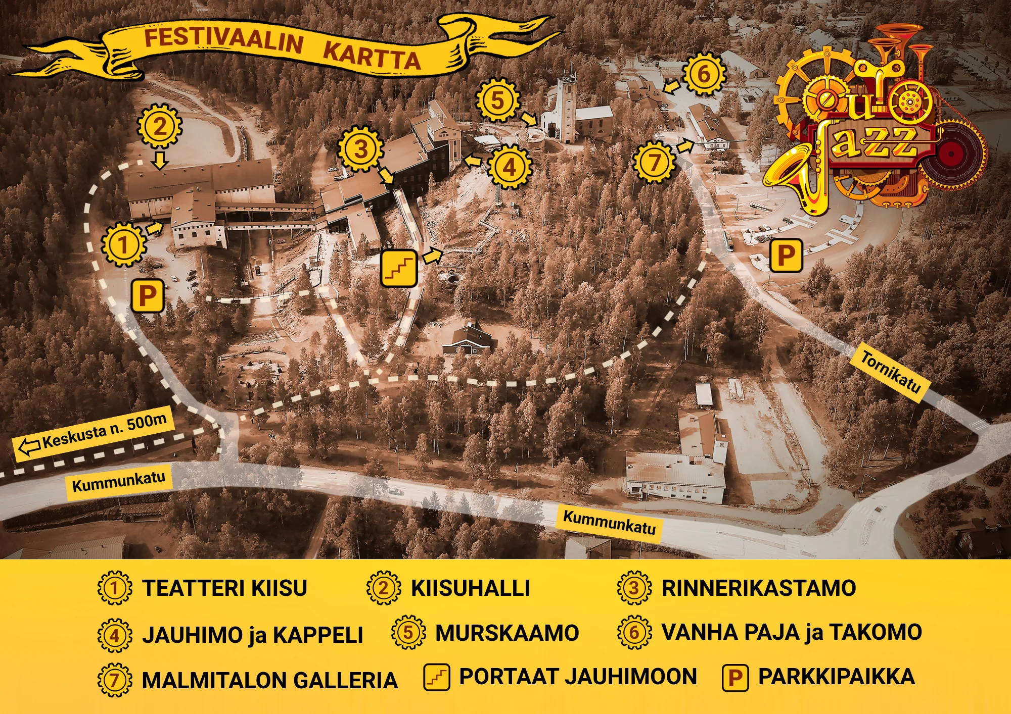 Festivaalin tapahtumapaikkana toimii ainutlaatuinen, historiallinen teollisuusmiljöö, Outokummun Vanha Kaivos. Alla olevasta kartasta löydät tärkeimmät festivaalipaikat, esiintymislavat ja muut keskeiset alueet.