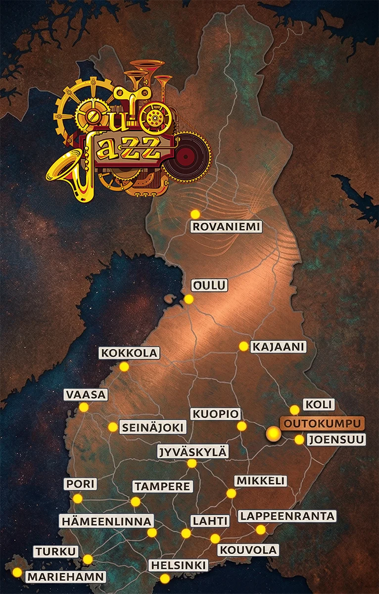 Alta löydät eri tavat saapua OutoJazziin sekä suuntaa-antavia etäisyyksiä eri puolilta Suomea.