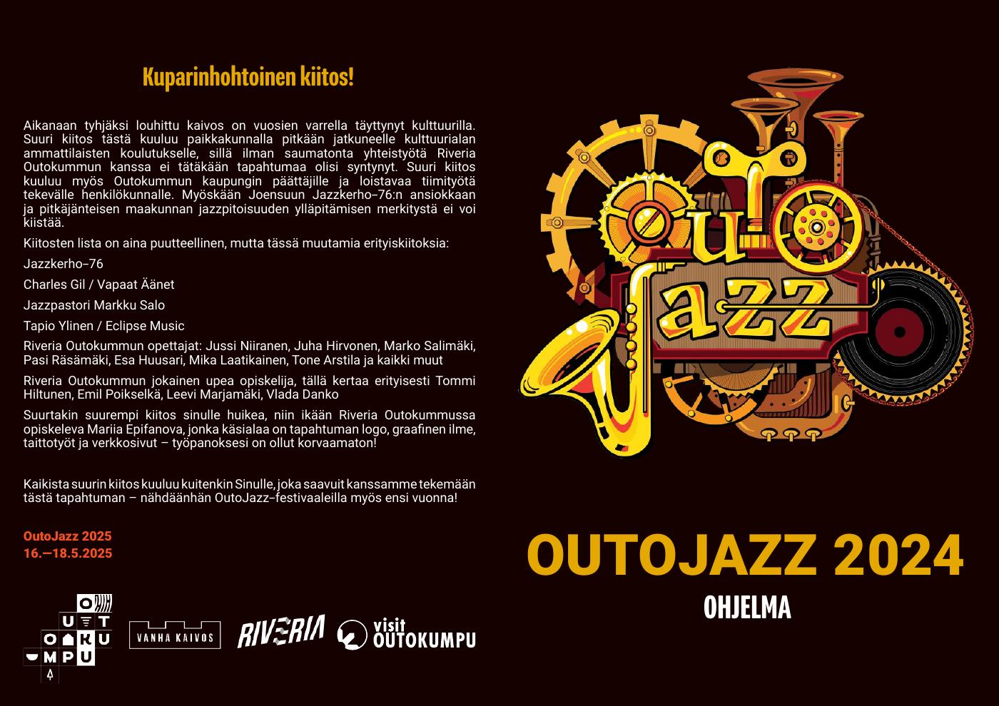 OutoJazz 2024 järjestettiin 10.–11.5.2024 Outokummun vanhalla kaivosalueella. Se oli OutoJazzin ensimmäinen vuosi, se oli hetki, jolloin jazz palasi Vanhalle Kaivokselle ja festivaalin tarina alkoi.